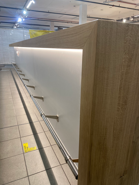 La réception du magasin d'Aligro a été conçu selon les plans fournis. Meubles en panneaux, plan de travail en granit, électroménager intégré et bar en chêne massif ont été assemblés pour former la réception.